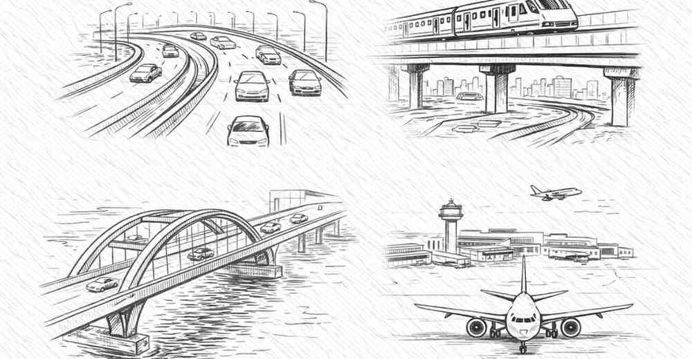 - Bridges and flyovers: Road overbridges, underpasses, elevated corridors