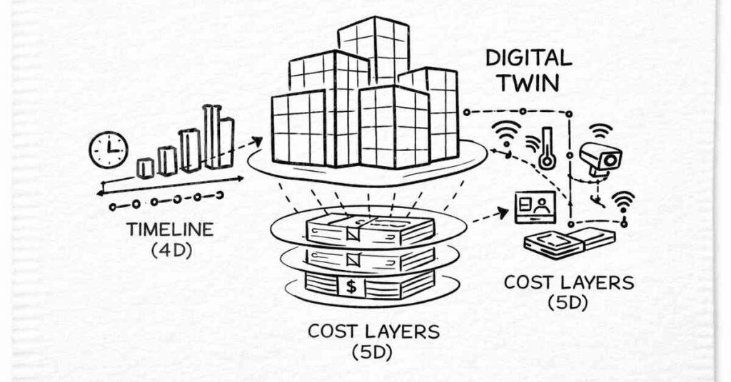 - 5D BIM adds cost data, allowing real-time budget tracking as design changes happen