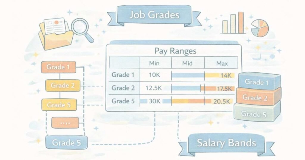 You design the architecture of how your organization pays people including creating job levels and grades (organizing similar roles into pay grades), defining salary ranges for each grade (minimum, midpoint, maximum), establishing pay progression guidelines (how people move through ranges), designing band overlaps and gaps, and determining how geographic location affects pay.