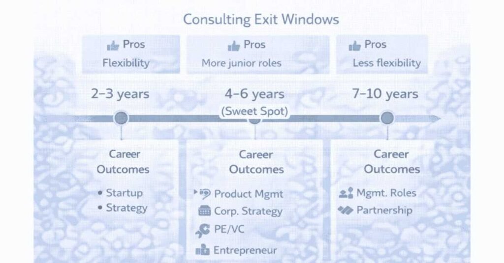 Here’s a truth most consulting firms won’t advertise: Most consultants don’t stay in consulting forever. While firms talk about the “path to partnership,” the reality is that 60-70% of consultants exit within their first 5-7 years—not because they fail, but because consulting becomes a launchpad to something else.