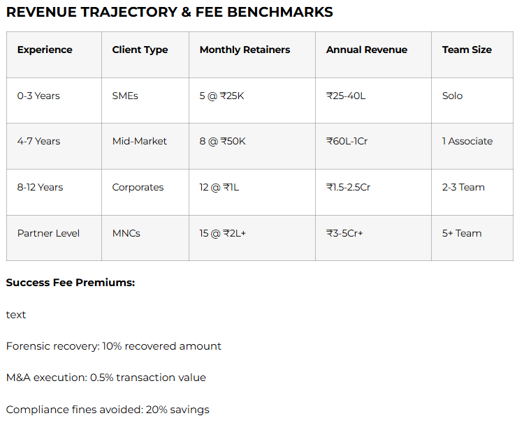 Consultants command premium positioning: ex-partners earn ₹2-5 crores advising portfolio companies, Big 4 GST heads ₹1.5-3 crores, forensic specialists ₹80 lakhs-2 crores per assignment. Zero office overhead, global client base, complete schedule control. Law firms cap billables at 2,000 hours; consultants scale infinitely through frameworks, teams, retainers.