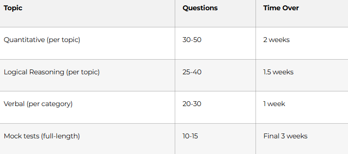 - Days 1-3: Hard questions from all quantitative topics (50)