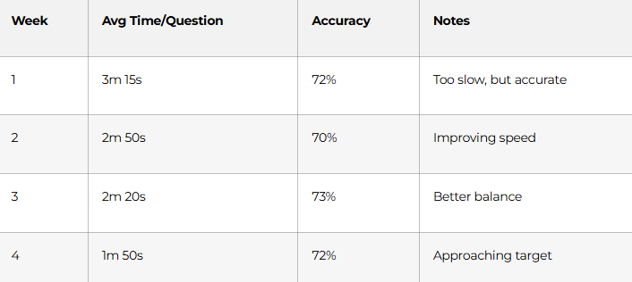 Goal: By week 8, aim for 1m 30s-2m per question with 75%+ accuracy