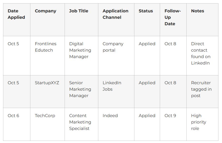 - Current status (applied, followed-up, rejected, interview scheduled)