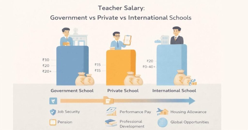 • Private school teaching: Growth-possible, performance-dependent. Realistic: ₹8-12 lakhs annually with experience.
