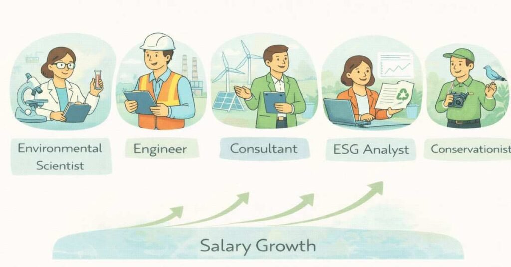 The key insight: while environmental careers may start modestly, they offer strong growth potential, especially as you develop specialized skills in high-demand areas like ESG, climate consulting, or environmental engineering.