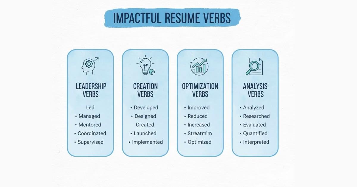 Here’s the reality: ATS systems and recruiters search for certain verb categories. Using weak verbs gets you filtered. Using strong verbs gets you noticed.