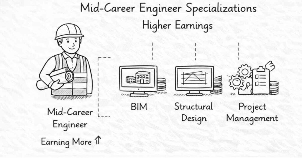 This is when your career choices start significantly affecting earnings. Engineers who’ve developed rare skills (BIM, advanced structural design, project management) earn notably more than general site engineers.