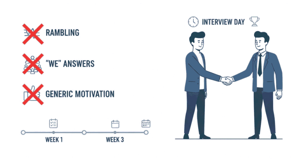 Daily commitment: 30-45 minutes for 3 weeks = fully prepared interviews reveal who you really are. The best preparation isn’t creating a fake persona—it’s reflecting deeply on your genuine experiences, learning from them, and communicating that growth authentically. Firms want real humans who’ve struggled, learned, and grown—not perfect robots.