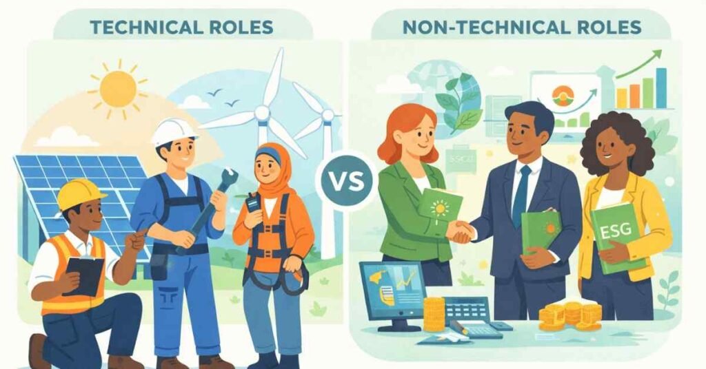 While technical roles like engineers, technicians, and designers typically require a background in science or engineering, many non-technical roles such as sales, business development, finance, and ESG consulting do not require an engineering degree. These roles value soft skills, certifications, and relevant experience.