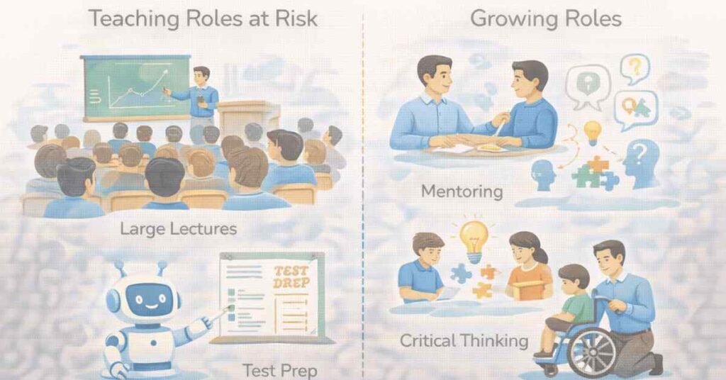 Key insight: AI excels at routine, repetitive tasks. Teaching’s most valuable parts—mentoring, motivation, guidance—remain uniquely human.