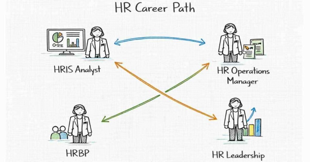 Roles: HR Generalist, HR Specialist (Recruiter, Compensation Analyst, L&D Specialist, HRIS Analyst), HR Executive, HRBP (early).