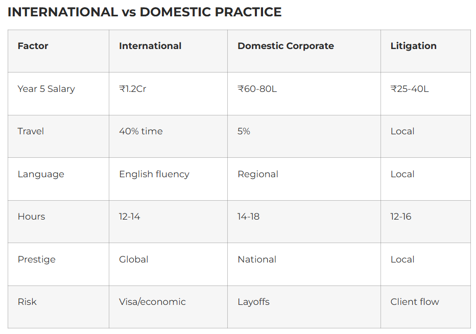 International practice rewards multilingual dealmakers comfortable in Singapore boardrooms, Geneva negotiations, London client dinners. If cross-border complexity excites you more than drafting sale deeds, crave global mobility over Mumbai apartment practice, seek Magic Circle salaries without UK cost of living, international law delivers highest legal earnings-to-stress ratio.