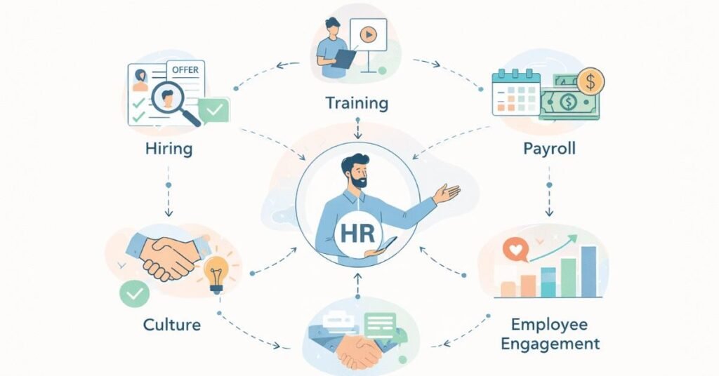But HR’s scope extends far beyond hiring and firing. Modern HR touches nearly every aspect of the employee experience including attracting and recruiting talented candidates, onboarding new employees effectively, training and developing employee skills, managing compensation and benefits, handling employee relations and workplace conflicts, ensuring compliance with labor laws, building positive organizational culture, supporting employee wellbeing and engagement, planning for future workforce needs, and using data to make informed people decisions.