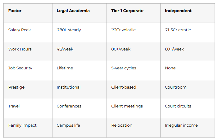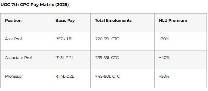 Forget courtroom combat or corporate deadlines—legal academia offers intellectual freedom to shape generations of lawyers while building enduring scholarly legacies. Your Supreme Court arguments become casebooks, research papers influence legislation, students credit you for judicial service success. NLUs transformed academia into premium careers: entry-level Assistant Professors earn ₹20-35 lakhs CTC, Professors ₹40-80 lakhs with housing, research grants, sabbaticals.