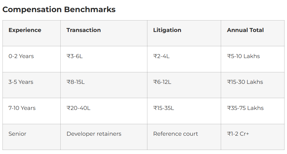 India’s real estate market hits $500 billion by 2025, fueled by 25 million annual homebuyers, Grade-A office absorption doubling, and warehousing boom from e-commerce. RERA (Real Estate Regulation Act) transformed dispute resolution, creating 50,000+ compliance cases yearly. Property lawyers earn steadily: ₹12-35 lakhs mid-career, specialist developers’ counsel ₹50 lakhs+, litigation seniors ₹1 crore+ from stamp/reference court victories.