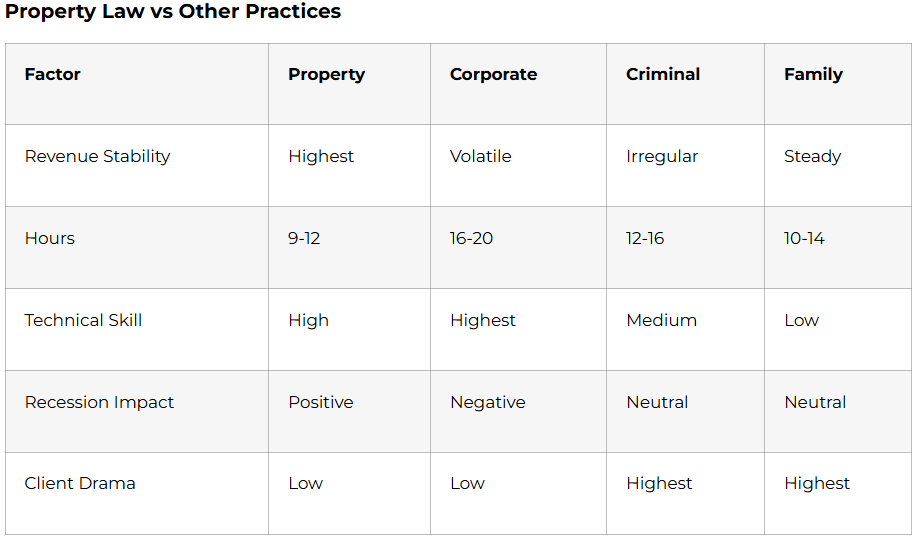 Property practice offers stability absent in volatile corporate law. Recessions boost distressed asset purchases; booms fuel transaction volumes. If document forensics, revenue optimization, and ₹10-100 crore deal structuring excites you, property law delivers consistent high earnings with manageable hours.
