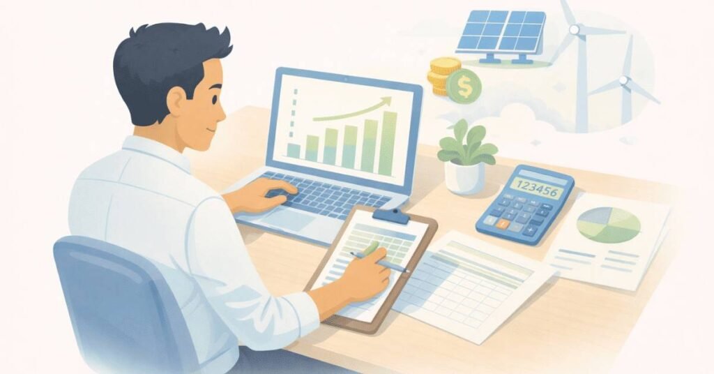 Clean Tech professionals discussing sales growth, finance charts, and partnerships with renewable energy background