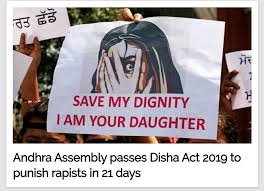The AP state government has prestigiously introduced the DISHA BILL to safeguard the women from abusers, rapists. The main aim of the bill is to provide justice and to punish the culprit within 21 working days.